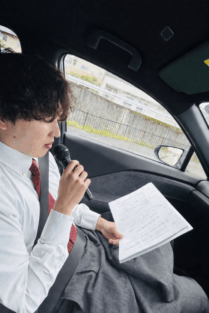 撮影に向かう途中、一生懸命練習中です!