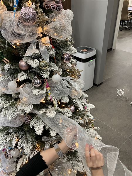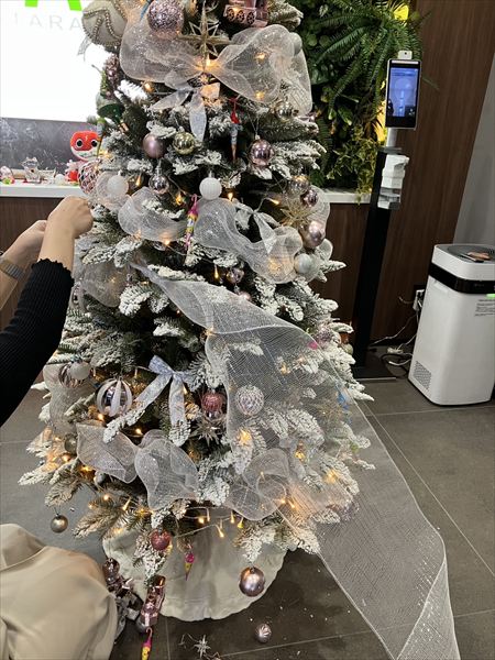 飾り付けに汗が滲む思い。2人でマサイ族のようにツリーの周りをぐるぐると回りリボン巻き。