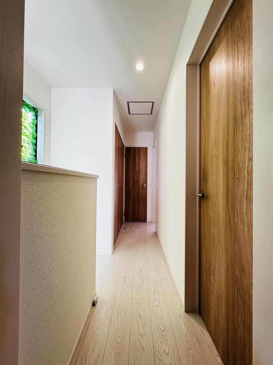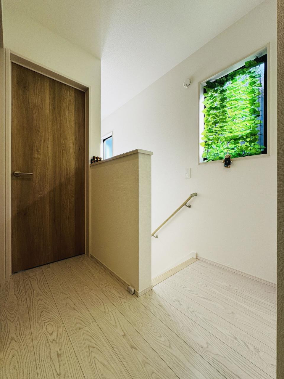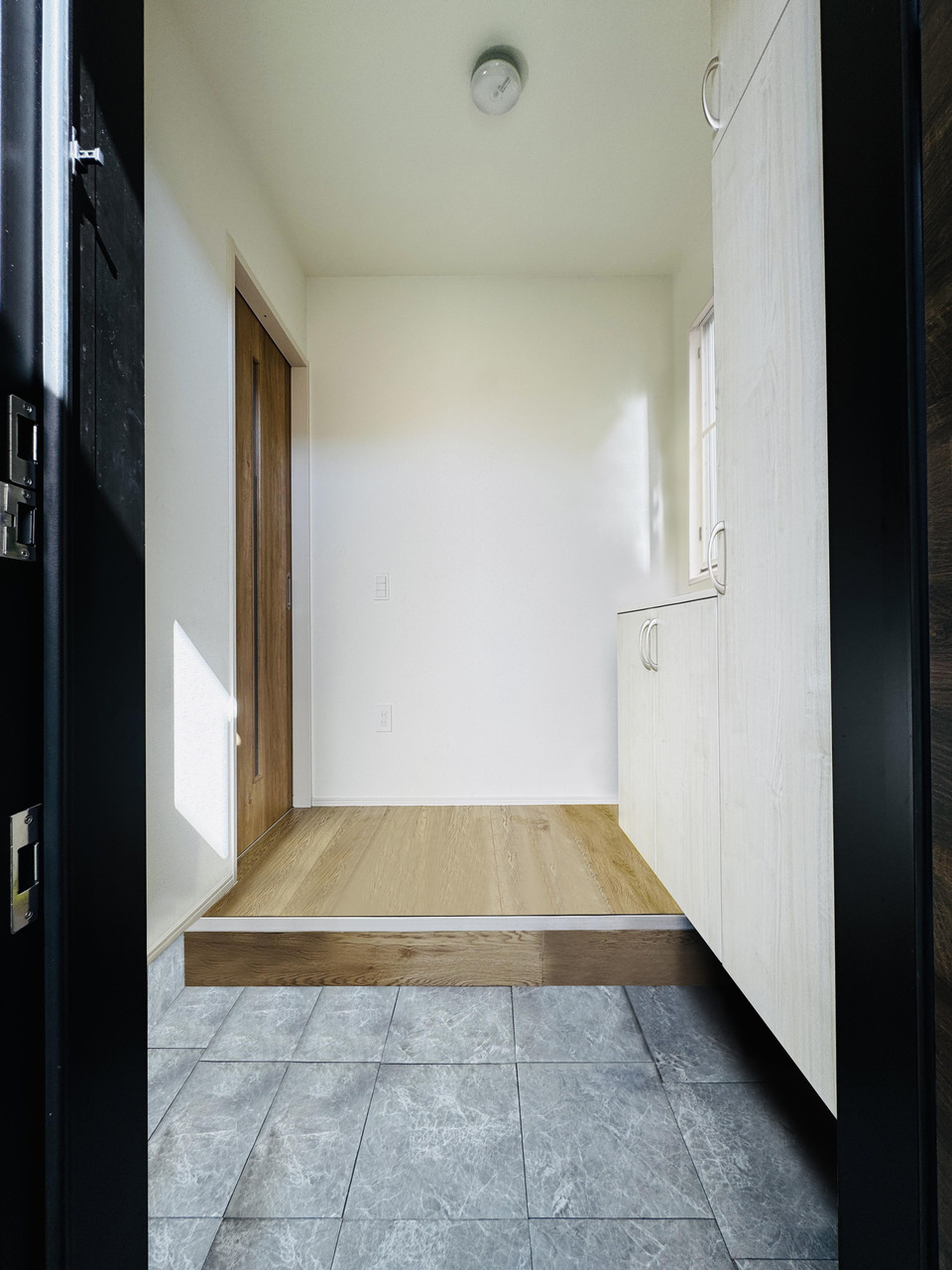 木目の玄関ドアには縦長の窓を組み合わせ、統一感のあるデザイン°˖✧