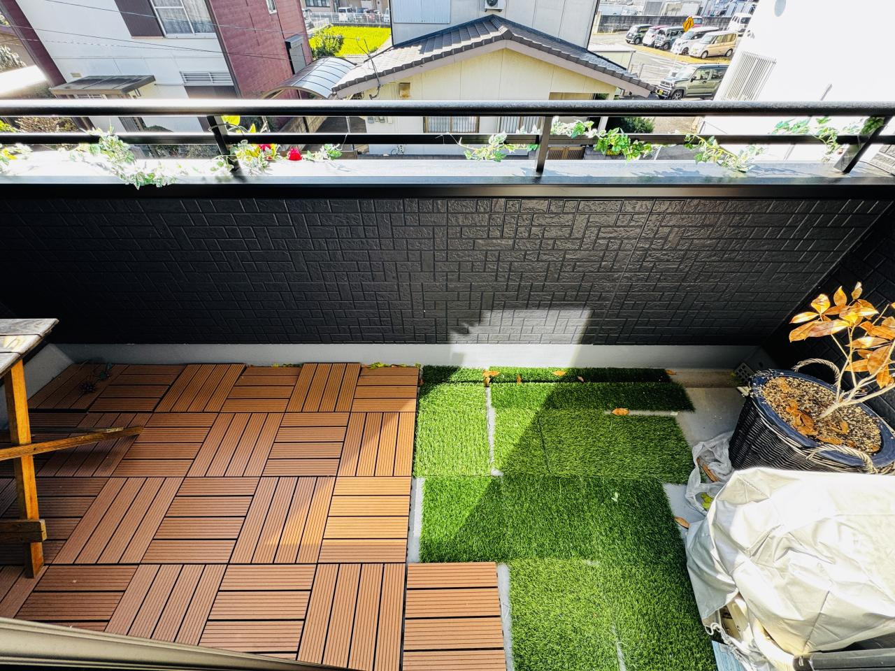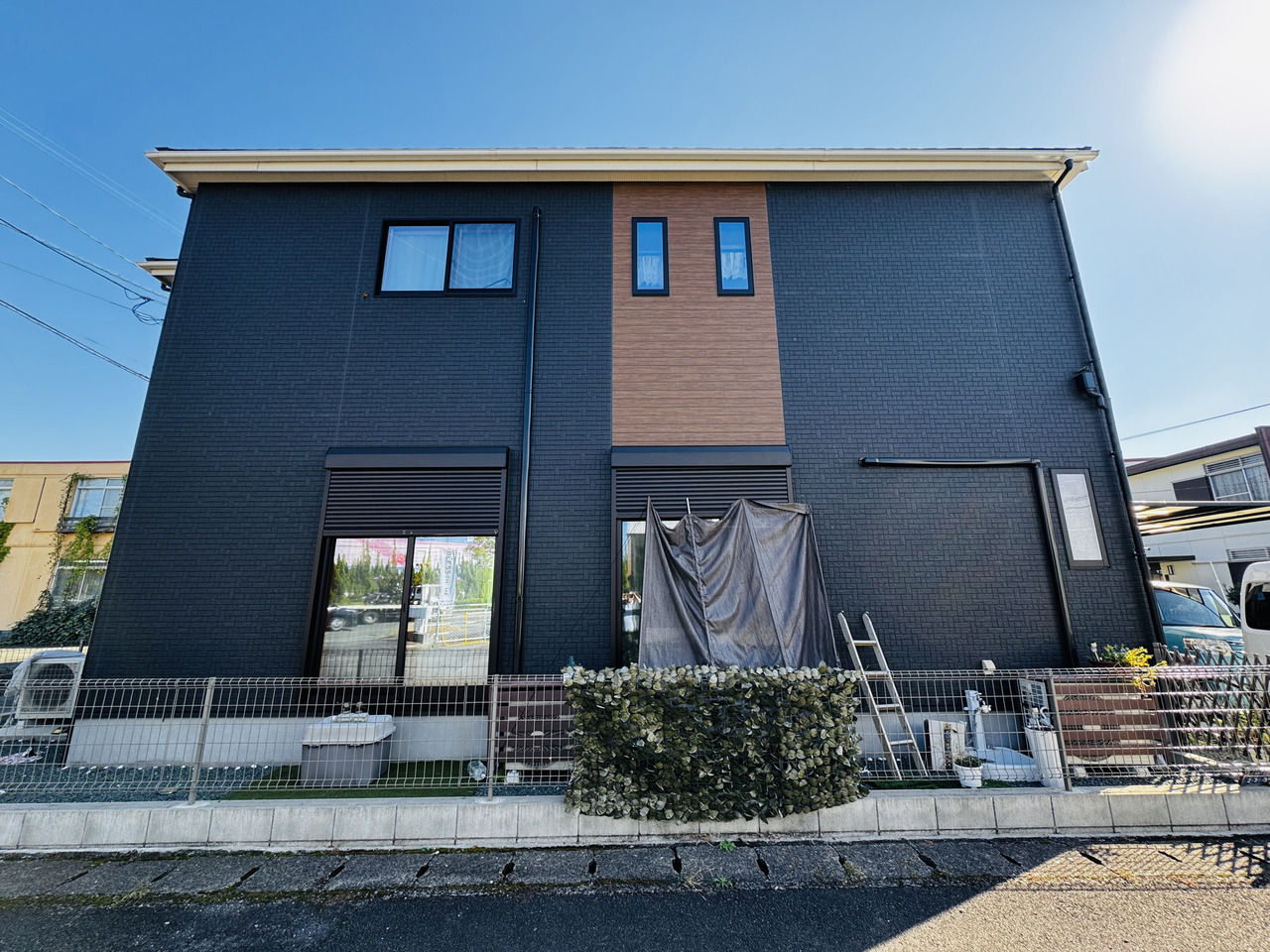 深い黒の壁と温かみのある木目がほどよく調和し、落ち着いたモダンな印象です。