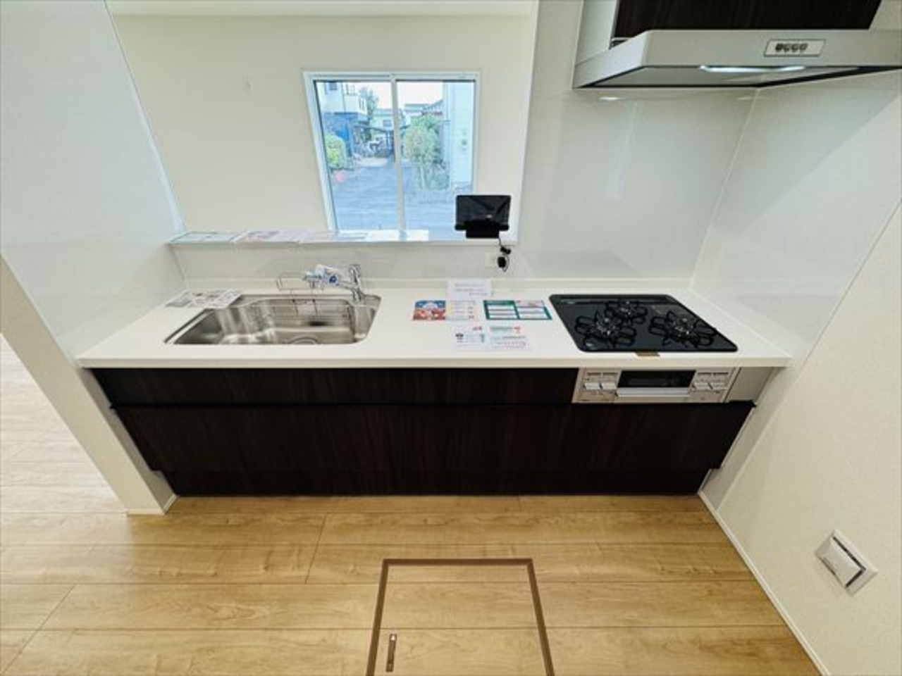 リビングを見渡せる対面式キッチンは、料理中でも家族の笑顔を身近に感じられる心地よい空間。