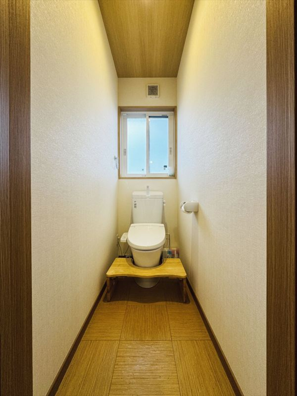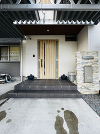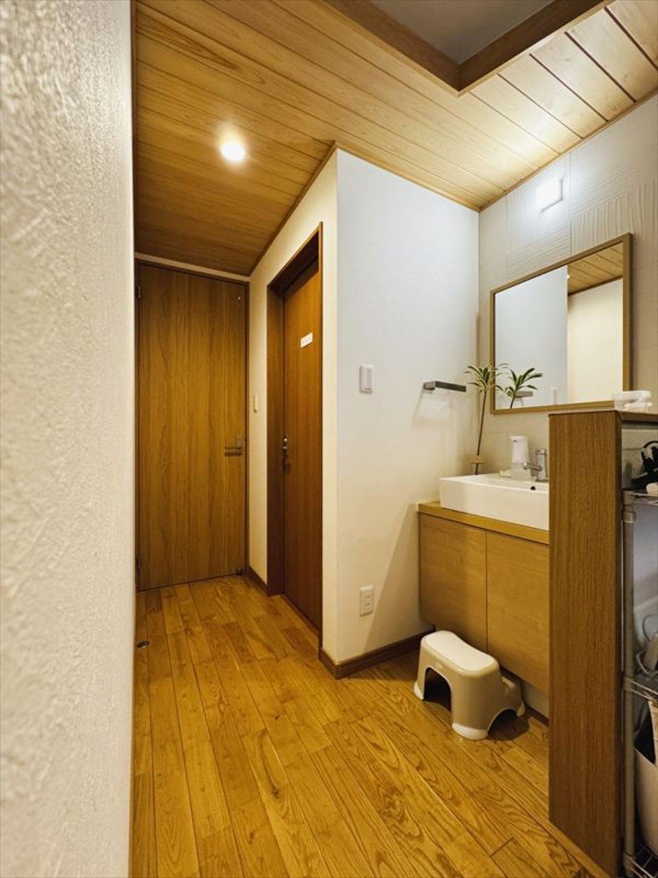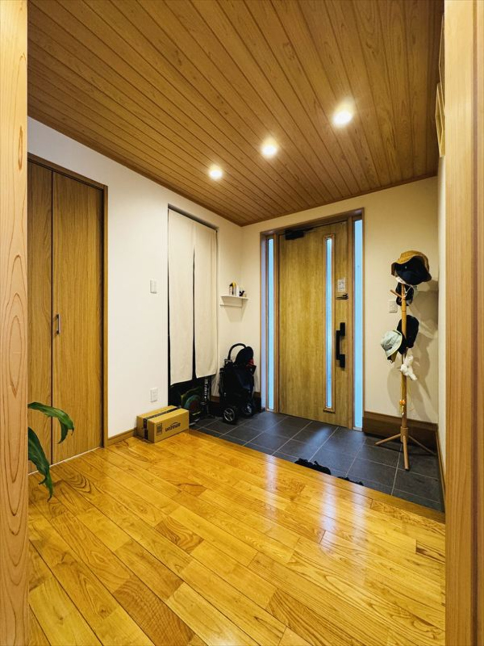 玄関天井には檜を使用。扉を開けた瞬間に広がるヒノキのやさしい香りと、ぬくもりある空間が、帰宅のたびに心をほっと和ませてくれます♪