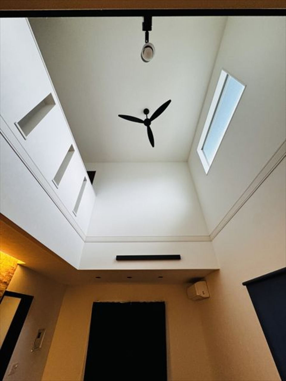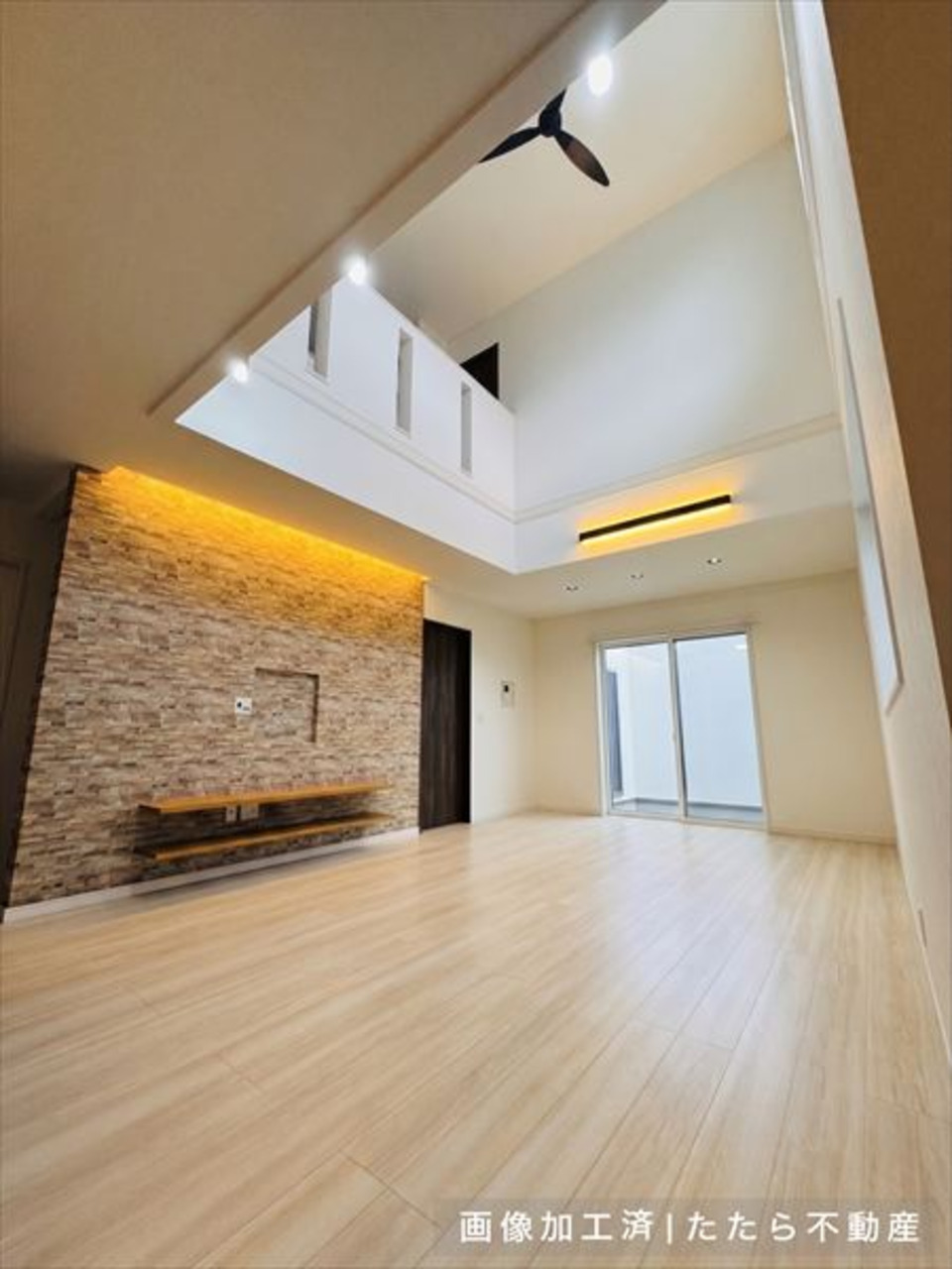 天井の高さが生み出す伸びやかな空間に、シーリングファンや間接照明がやさしいアクセントとなり、落ち着きのある上質な雰囲気を演出しています。